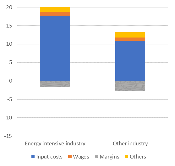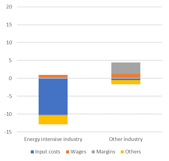 Notes: Sales refers to nominal sales in euro. Analysis is carried out at the detailed sector level. Manufacturing industry is split into 48 sub-sectors according to the classification used for the Supply Use Table (SUT). Energy intensive industry includes Belgium most gas intensive sectors, i.e. fruit and vegetables, fertilisers, inorganic chemicals, agrochemicals, glass, bricks, cement and lime, concrete, steel and steel rolling. Other industry includes the 38 other manufacturing sectors.