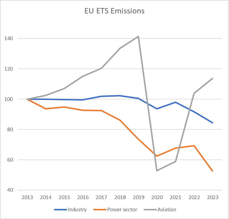 Notes: Power sector includes emissions from stationary installations with NACE 2-digit code 35. Industry includes emissions from all other stationary installations. 2013 is chosen as reference year as this is the start of Phase 3 of the EU ETS. Excludes emissions from Great Britain.