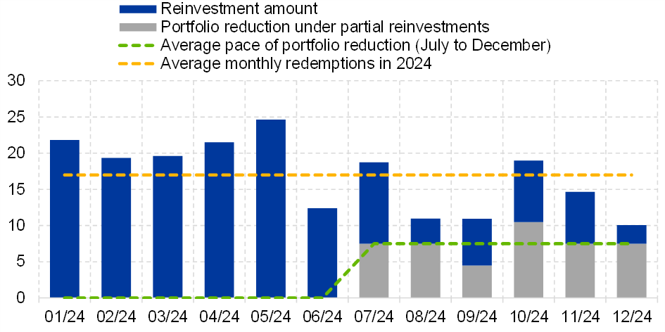 This averaging provided some leeway in how the reduction was implemented. The aim was to balance the Eurosystem’s market presence, taking seasonal patterns of redemptions and issuance into account. In this context, the portfolio reduction pace (grey bars) was adjusted in two months (down in September and up in October), with the average reduction pace amounting to €7.5 billion over the partial reinvestment period.