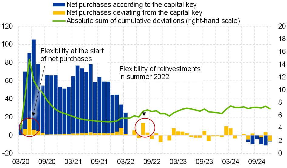 Chart 2 uses the monthly data to illustrate how flexibility across jurisdictions was used to counter risks to the monetary policy transmission mechanism. The vast majority of purchases during the net asset purchase phase were conducted in line with the capital key (dark blue bars).