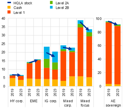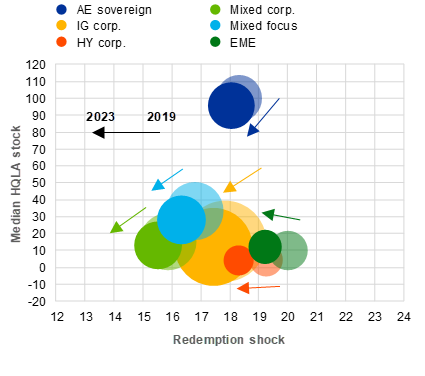 Notes: Panel a: redemption shocks (plotted on x-axis) are calculated, for each fund type, as the 5% expected shortfall of the distribution of monthly net flows experienced by funds between January 2007 and December 2019 (transparent bubbles) and January 2007 and June 2023 (solid bubbles) – in line with the methodology applied by ESMA*. The expected shortfall averages net flows below the 5th percentile of the distribution. The size of the bubbles shows the total size of the fund groups in millions of euro for December 2019 (transparent bubbles) and June 2023 (solid bubbles). Panel b: HQLA holdings and stock are weighted by funds’ total net assets. Arrows connect the weighted average HQLA stock per sub-group in Q1 2019 and Q2 2023. Funds’ holdings are classified at the security-level according to the Basel Liquidity Coverage Ratio requirements for HQLA. HQLA Level 1 assets include cash, cash equivalents and qualifying government bonds; Level 2A and 2B include less liquid assets such as qualifying covered bonds, corporate bonds, asset-backed securities and stocks. The HQLA stock is then calculated by applying no haircut to cash and Level 1 assets, 15% to Level 2A assets and 40% to Level 2B assets. Both panels: funds are categorised into six sub-groups based on their portfolio holdings, i.e. when 60% or more of their total net assets are invested in the corresponding asset category. “AE sovereign” includes government bonds issued by advanced economies in accordance with the IMF country classification; for “Mixed corp.”, HY and IG corporate bonds collectively meet the 60% threshold; “Mixed focus” includes the remainder of funds not reaching the 60% threshold. AE stands for advanced economies; IG stands for investment grade; HY stands for high yield; EME stands for emerging market economies.