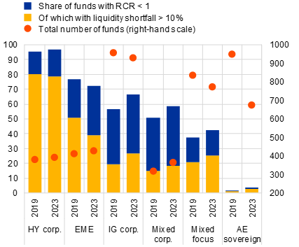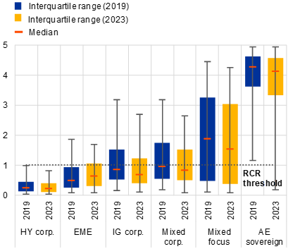 Heightened liquidity vulnerabilities indicate that large-scale redemptions could lead to stress within the bond fund sector, with negative repercussions for the underlying markets. The RCR results are relevant in the current market environment where negative surprises concerning the credit and growth outlook could trigger large redemptions. This, in turn, increases the potential for forced asset sales, increasing the likelihood that stressed funds could amplify negative movements in underlying market prices and liquidity. Consequently, the results also highlight the need to better align asset liquidity with fund redemption terms, in line with the Financial Stability Board recommendations that seek to address structural liquidity mismatch in open-ended investment funds.[8]