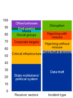 State-sponsored cyberattacks primarily target state institutions and critical infrastructures and are mainly aimed at data theft. The principal targets of state-sponsored cyberattacks are state institutions such as governments and ministries, the armed forces and public administration (Chart A, panel c). Primary targets in critical infrastructures include the telecommunications, energy and financial sectors as well as defence and transport companies. In addition, other companies and social groups are targeted, including activists and political opposition groups and, to a lesser extent, the media and end users (e.g. individuals). Attacks on specific sectors (e.g. the financial industry[3]) tend to be clustered over time. There are many reasons why sovereign states engage in malicious cyber activities, although attacks are aimed predominantly at data theft, potentially linked to espionage. However, and especially in times of open conflict, the goal of sabotage and data destruction is to cause maximum disruption by interfering with an opponent’s military operations or by destabilising civilian life. Disruptive attacks can also be used to exert pressure in the hope of forcing a change in behaviour or political position. As such, some cyberattacks can be a part of influence campaigns around important elections, for instance. In addition, some cyber activities are aimed at expropriation, in particular via ransomware attacks or the theft of crypto-assets.