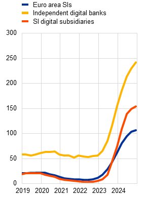 Digitalisation is transforming the delivery of banking services, leading to the emergence of new digital bank business models. Digital banks do business solely in the online space, without developing bricks-and-mortar branch networks. As at year-end 2024, about 60 banks in the euro area were identified as being digital-only.[1] Seven of these banks are subsidiaries of traditional banks. The market share of digital banks increased from 3.1% of total assets in 2019 to 3.9% in 2024 thanks to the expansion of established players and the entry of new competitors. This box spotlights features of digital bank business models, contrasts them with those of traditional banks and presents the financial stability risks that may be associated with the rise of digital banks.