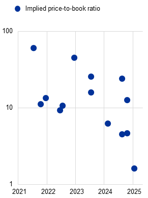 (Q1 2019-Q4 2024, percentages) | (Q1 2019-Q4 2024, basis points) | (x-axis: Jan. 2021-Mar. 2025, fundraising date; y-axis: implied price-to-tangible book value ratio, multiples, log scale) |