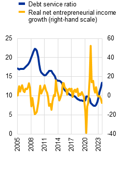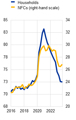 Euro area household and corporate balance sheets have been bolstered by a resilient labour market and strong post-pandemic profits. Corporate profitability has continued to hold up relatively well, supporting firms’ debt servicing capacity (Section 1.3). Declining energy and other input costs have boosted corporate earnings despite weak consumer demand, although the impact of anaemic growth and higher labour costs on profit margins might not have fully materialised yet. While corporate insolvencies have continued rising to above pre-pandemic levels in a number of euro area countries, defaults and non-performing loan rates have remained relatively low. At the same time, euro area household vulnerabilities have been mitigated by the resilience of labour markets, coupled with government support measures and excess savings accumulated during the pandemic. While household and corporate debt-to-GDP levels have dropped below pre-pandemic readings, the pass-through of higher interest rates to debt service costs is incomplete. Continued loan repricing at higher market rates than on outstanding loans (Chart 3, panel c), together with weaker than expected growth and deteriorating labour market conditions, could erode household and corporate debt servicing capacity. At the same time, evaporating liquidity buffers (Chart 4, panel a) may render households and firms vulnerable to unexpected adverse shocks.
