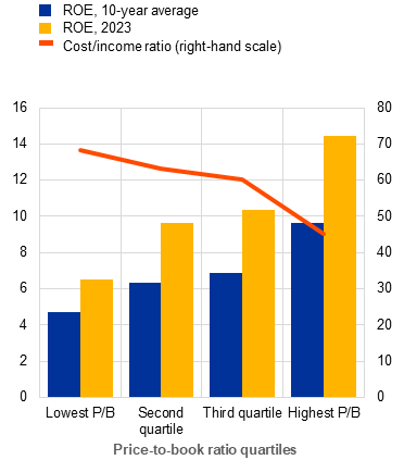 Against this backdrop, three key themes are shaping the outlook for euro area financial stability. First, benign risk pricing in financial markets and structural liquidity vulnerabilities in non-banks harbour the potential for sudden shifts in market sentiment in response to adverse shocks, triggered, for example, by negative macro-financial surprises or heightened geopolitical tensions. Second, rising debt service costs are challenging euro area households, firms and sovereigns with weak balance sheets, and the downturn in property markets is, in some cases, compounding household and corporate vulnerabilities. Third, euro area banks have remained resilient, supported by strong profitability. Bank earnings appear set to moderate somewhat from recent highs in the next two years. At the same time, bank market values, while having risen somewhat, remain stubbornly below book values − indicating deeper seeded investor concerns about the durability of bank profitability.