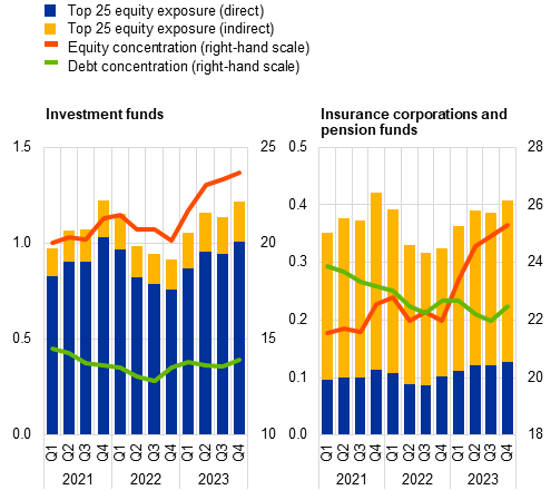 The non-bank financial intermediation sector could still amplify any market correction, given liquidity vulnerabilities, leveraged exposures and rising concentration risks. Non-banks have benefited from improving market conditions in recent months, supporting their portfolio valuations, while higher interest rates have also boosted investment income from debt securities. However, asset quality in non-bank portfolios may still be impaired by worsening corporate sector fundamentals and real estate market conditions together with rising geopolitical risk (Special Feature A). In this context, any shocks to market valuations could trigger a rise in investment fund outflows or margin calls on derivative exposures. Given low liquid asset holdings and significant liquidity mismatches in some types of open-ended investment funds, this could result in forced asset sales that may negatively affect wider financial stability (Chart 2, panel c). Although generally limited, pockets of elevated financial and synthetic leverage in some entities may add to spillover risks. In addition, concentration in equity portfolios − notably in investment funds due to exposures to US-based technology firms − has increased markedly in recent years (Chapter 4), making investment portfolios more vulnerable to idiosyncratic shocks or adverse developments in the US economy. For the insurance sector, uncertainties around a weak macro-financial outlook highlight possible profitability headwinds. These include both underwriting profitability challenges for life insurers and consistently low returns on debt securities portfolios.