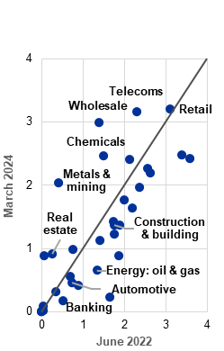 We define the interest coverage ratio as earnings before interest, depreciation and amortisation (EBITDA) plus cash and cash equivalents, divided by annual interest payments. This indicator measures the ability of firms to meet interest payments in the next 12 months and does not capture firms’ vulnerability over a longer horizon. The ICR decreases when a firm’s capacity to service its debt weakens. The ICR is correlated with other measures of a firm’s financial distress; see the box entitled “Corporate vulnerabilities and the risks of lower growth and higher rates”, Financial Stability Review, ECB, November 2023. Firms that cannot service their debt may adjust by reducing investment outlays or personnel costs, or selling assets, meaning that an ICR below 1 does not necessarily lead to them defaulting on their debt.