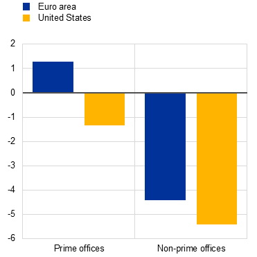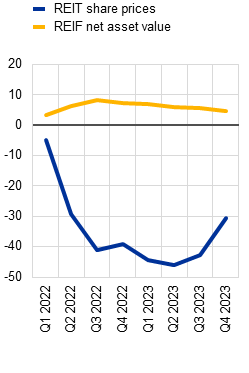 Tight financial conditions have underscored vulnerabilities in real estate markets, compounding the challenges faced by some households and firms. The sharp downturn in the commercial real estate (CRE) sector has continued (Chart 5, panel a), with subdued market activity continuing to hamper price discovery. Prices could decline further, given structurally lower demand for some CRE assets post-pandemic, notably in the office segment (Section 1.5). Sharp drops in rental income and profit margins since early 2022 have made real estate firms particularly vulnerable to losses, compounding the challenges posed by refinancing debt at higher rates (Box 1). The ongoing adjustment in residential real estate (RRE) markets has remained orderly, as households’ financial positions have been underpinned by the strength of the labour market. There have also been signs of incipient stabilisation of euro area house prices at the aggregate level, but risks remain tilted to the downside, especially in countries with elevated debt levels and overvalued property markets. That said, the expected decline in borrowing costs might alleviate affordability challenges and boost loan demand going forward. Overall, the downturn in the RRE market should remain orderly, unless labour market conditions deteriorate significantly.