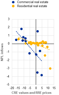 a) CRE values, RRE prices and net NPL inflows across euro area countries | b) Bank funding costs on new funding, by type of funding source | c) Euro area banks’ net interest rate spread and margin |