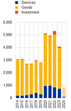 National budget deficits are expected to stay larger than they were before the pandemic as many of the support measures taken have remained in place. While most of the energy and inflation support measures introduced after the Russian invasion of Ukraine are being phased out, many of the measures taken during the pandemic have not been fully rolled back. Moreover, structural primary balances (i.e. budget balances adjusted for the impact of changes in economic growth due to business cycle fluctuations and excluding interest payments on outstanding debt) are expected to remain well below pre-pandemic levels over 2024-25. This is the case for almost all euro area countries, irrespective of their starting level of sovereign debt (Chart 1.3, panel b). Potential fiscal slippages are an additional concern, as weakening economic activity has already contributed to some countries missing deficit targets in 2023, and the upcoming cycle of elections is increasing the risk of fiscal targets being missed as well. The lack of envisaged fiscal consolidation, combined with high debt levels, makes national budgets vulnerable to intensifying geopolitical tensions should these require increases in spending on defence, for example. It would also be more difficult to accommodate additional investment in areas such as climate change and digital technology, which would have a negative effect on euro area growth potential.