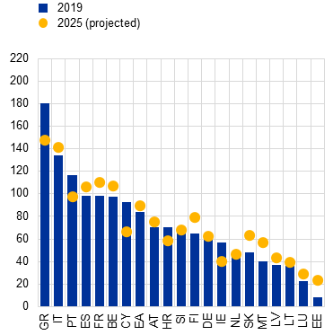 a) Change in euro area government debt-to-GDP and its drivers | b) Projected government debt-to-GDP ratios across euro area countries |