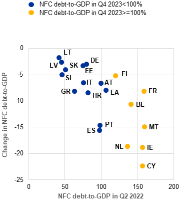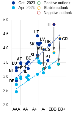 Notes: Panel a: NFCs stands for non-financial corporations. NFC debt is illustrated in unconsolidated terms, i.e. including intra-sectoral loans. “Pre-pandemic” indicates figures as at Q4 2019, “Pandemic peak” refers to Q1 2021, and the latest observation captures Q4 2023. Panel b: ratings and rating outlooks are aggregated from S&P, Moody’s and Fitch and are shown as at 31 October 2023 and 30 April 2024. Rating outlooks are only indicated for those sovereigns for which the aggregated outlook has changed since October 2023. Aggregated outlooks can be determined by the outlook from a single agency; for instance, two stable outlooks and one negative outlook, which was the case for Italy in October 2023, are aggregated to form an overall negative outlook.