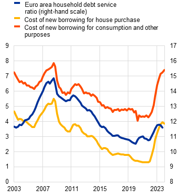 Euro area households, firms and sovereigns have so far remained resilient on aggregate, albeit with some pockets of vulnerability. The indebtedness of euro area households, firms and sovereigns has declined from post-pandemic highs (Chart 3, panel a), alleviating debt sustainability concerns. However, associated vulnerabilities remain elevated, especially among sovereigns. Here indebtedness remains above pre-pandemic levels, owing partly to a transfer of risk from the private sector to sovereign balance sheets during the pandemic as well as during the recent energy crisis and period of high inflation. The debt service costs of non-financial sectors are likely to remain at current high levels or even creep up further as the debt originally contracted at historically low interest rates and at long maturities continues to reprice at prevailing, significantly higher, interest rates. This means that a vulnerable cohort of highly indebted households, firms and sovereigns may still see their debt servicing capabilities challenged going forward.