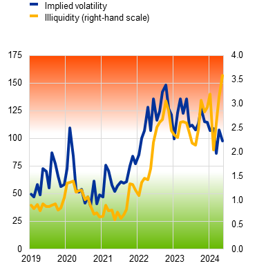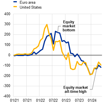 Expectations of monetary policy easing have boosted investor demand for risky assets, but risk sentiment in markets has been fickle. Expectations that monetary policy will ease around the world have been fuelling investors’ appetite for risky assets since October 2023, as markets have been pricing-in a soft landing for the global and euro area economies. Reflecting this, stock prices have increased and credit spreads have narrowed, with a short-lived reversal more recently (Chart 2, panel a). At the same time, equity market volatility has remained relatively subdued, despite the recent uptick and continued substantial uncertainty in both the macro-financial and geopolitical environments, and has diverged from volatility in interest rate markets, which has been elevated (Box 2). In this environment of substantial risks to growth and structurally higher funding costs, markets might underestimate and under-price the likelihood and the impact of adverse scenarios, which could cause vulnerabilities to build up. Moreover, there is a greater likelihood of negative surprises resulting in abrupt shifts in sentiment. Volatility in financial markets could increase significantly, should inflation deviate substantially from consensus expectations, if economic growth weakens or if geopolitical conflicts escalate further (Chart 2, panel b). Heightened concentration and high valuations in equity markets, notably in the United States, indicate scope for greater volatility and potential for a market correction. Given deeply integrated global equity markets, financial stability risks for the euro area might stem from adverse spillovers from the United States.