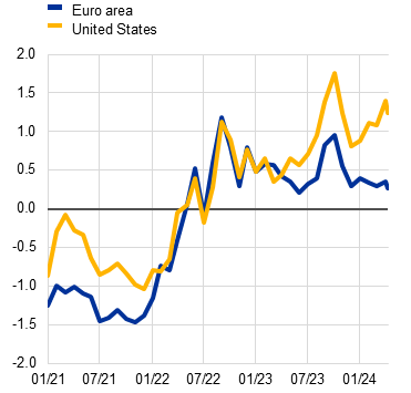 Risks to the macro-financial outlook remain elevated. Several such risks are related to external factors. Global demand could surprise to the downside if tight financing conditions continue to squeeze incomes and expenditure more strongly than expected, or if higher than expected inflation in the United States leads to a delayed easing of US monetary policy spilling over to tighter financing conditions globally. Divergent policy paths between the United States and the euro area would in turn increase the risk of adverse spillovers to European financial markets (Chart 1.2, panel a). Demand for euro area exports could be further weakened if the ongoing adjustment in property markets in China has a more pronounced, negative impact on its broader economy. As some euro area economies with relatively weaker near-term growth prospects depend heavily on exports to China, this would further amplify divergence between growth outcomes in the euro area. While progress has been made in bringing euro area inflation down, domestic price pressures are still high, owing in part to strong wage growth which could still surprise to the upside given how tight labour markets are. Globally diverging monetary policy paths could also lead to higher inflation via their impact on the euro exchange rate and import prices.[1] Finally, geopolitical tensions could, as a result of their impact on commodity prices and global supply chains, lead to renewed inflationary pressures in the euro area as well.