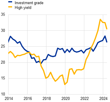 While sovereign financing conditions have improved, borrowing needs are high and could be tested by rising geopolitical tensions and other risks. Euro area sovereigns have benefited from easier global financing conditions in recent months, and demand for sovereign debt has been strong as investors try to lock in higher yields before the expected cuts in central bank interest rates materialise (Chart 1.3, panel a). Spreads between lower- and higher-rated sovereigns have also declined (Chart 3, panel b in the Overview), reflecting favourable risk sentiment, as well as better prospects for growth in lower-rated countries and declining debt-to-GDP ratios. Nevertheless, since yields on new sovereign issuances are still above average yields on outstanding debt, sovereign interest burdens are continuing to rise. This could lead to greater challenges ahead, particularly for countries with greater short-term financing needs. Any reassessment of sovereign risk by market participants due to high debt levels and lenient fiscal policies could raise borrowing costs further and have negative financial stability effects, including via spillovers to private borrowers and to sovereign bond holders. Finally, rising geopolitical tensions and upcoming elections in many countries are increasing uncertainty around future borrowing needs.