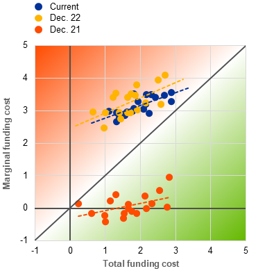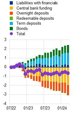 It should be noted that this does not separate the rate effect from the composition effect for shifts from overnight deposits to term deposits. Calculations based on ECB (MIR, BSI) data suggest that for NFC deposits, this effect accounts for about 15% of the increase in funding costs.