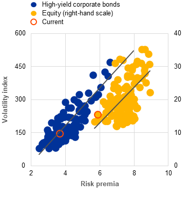 a) Global equity markets and high-yield corporate bond spreads | b) Historical volatility distributions, by geopolitical risk regime | c) Liquidity mismatch and leverage among euro area investment funds |