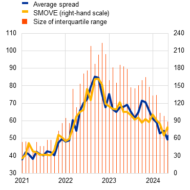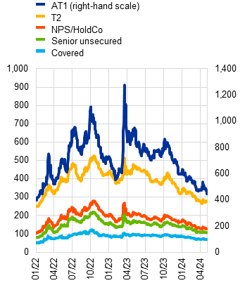 (1 Jan. 2021-7 May 2024; index, basis points) | (3 Jan. 2000-7 May 2024, indices) | (Q4 2023, ratios, bubble size: total assets, € trillions) |