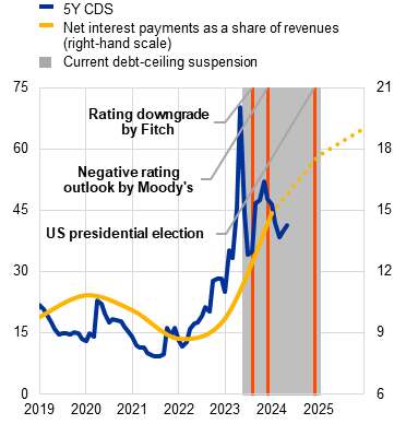 Sovereign financing conditions have improved, but fiscal fundamentals remain vulnerable to negative growth surprises and fiscal slippage. Sovereign borrowing costs have benefited from easier financing conditions of late and positive rating actions in some countries (Chart 3, panel b). Interest costs are set to rise further, however, especially for sovereigns with high short-term refinancing needs, as maturing public debt is rolled over at higher interest rates. Despite falling debt-to-GDP ratios in recent years, fiscal fundamentals remain fragile in a number of countries, as indicated by missed deficit targets in some cases in 2023. Given structural headwinds to potential growth from factors such as weak productivity, persistently elevated debt levels and budget deficits would be more likely to reignite debt sustainability concerns and push sovereign credit risk premia higher in the event of adverse macro-financial surprises. Risks of fiscal slippage in the light of a busy electoral agenda in 2024-25 (at both national and EU levels) or uncertainties around the exact implementation of the new EU fiscal framework could lead market participants to reprice sovereign risk. On the other hand, greater fiscal reform to ensure that public finances have a more growth-friendly composition could enhance the medium-term economic growth potential of the euro area, thereby mitigating debt sustainability risks.
