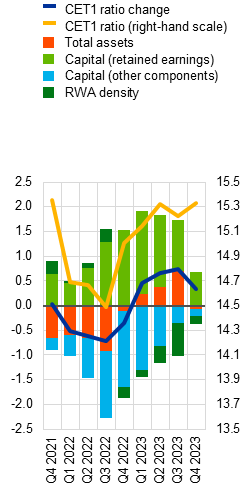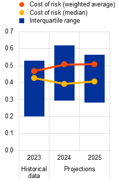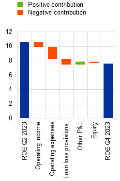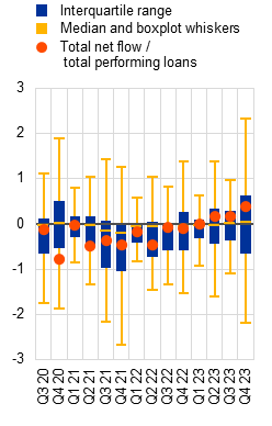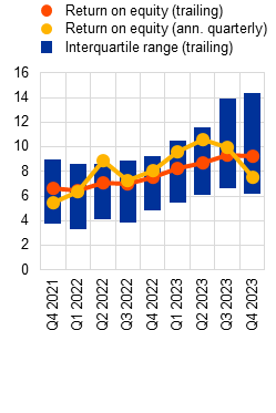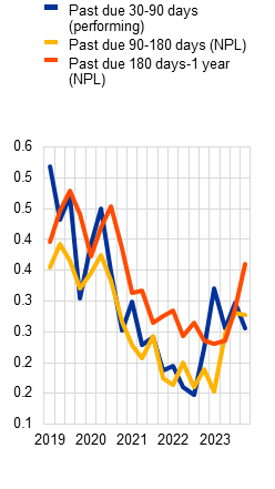 There are signs of deterioration in the asset quality of euro area banks, notably in CRE portfolios. While banks’ non-performing loan ratios remained at historically low levels just above 2% in 2023, there have been nascent signs of rising losses on a subset of loan portfolios that are more sensitive to cyclical downturns. In fact, CRE loan books have been the main driver of asset quality deterioration, reflecting both the downturn in euro area CRE markets and spillovers from the ongoing correction in US CRE markets to euro area banks with material exposures. That said, these portfolios are generally modest in size and should not have a systemic impact on the banking sector. For some banks with above-average CRE exposure, though, a marked deterioration in CRE asset quality could pose challenges. At the same time, the credit risk outlook for household and corporate portfolios remains tilted to the downside, as macro-financial conditions are weak and borrowers are increasingly feeling the impact of higher interest rates. As a result, banks may face the risk of higher provisioning costs if risks in the non-financial sectors materialise, not least because collateral values may not to be fully reflected in banks’ balance sheets.