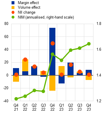 Notes: Panel a: NPL stands for non-performing loan. Panel b: market implied €STR is shown for April 2024 until March 2026. Panel c: net interest margin is shown until the fourth quarter of 2023.