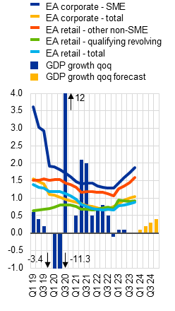 Sources: Bloomberg Finance L.P., LSEG, S&P Global Market Intelligence, Moody’s Analytics, Fitch Ratings, Eurostat and ECB (QSA), ECB (MIR) and ECB calculations.