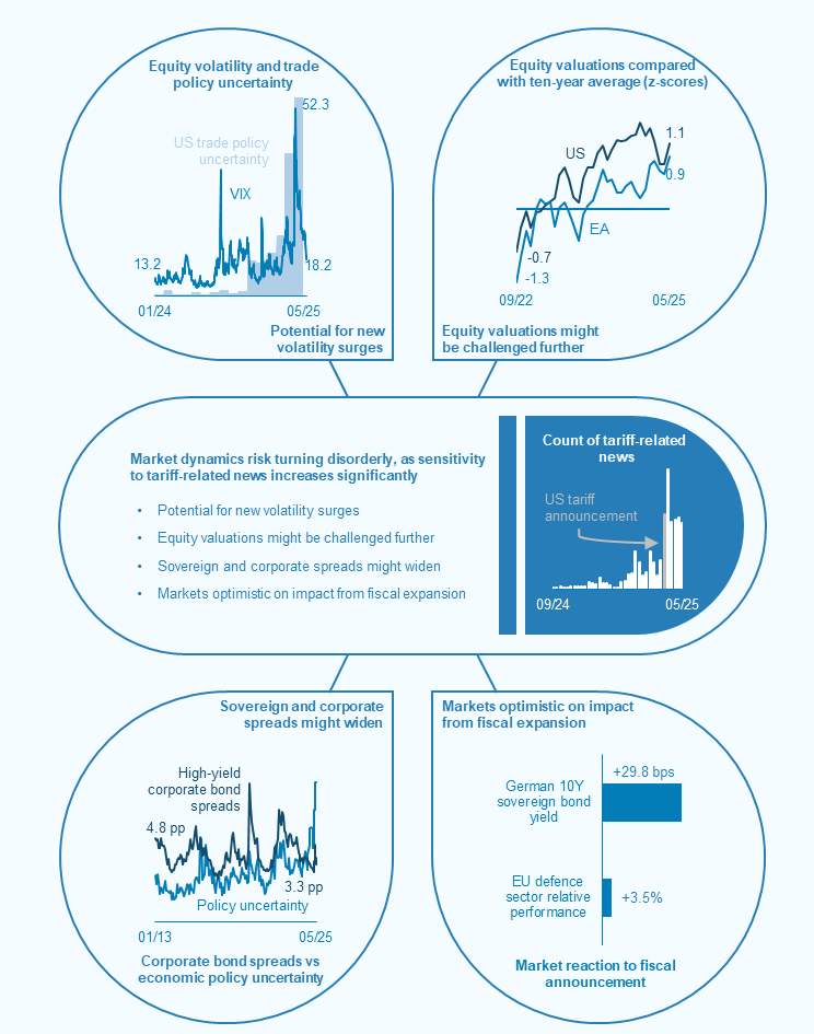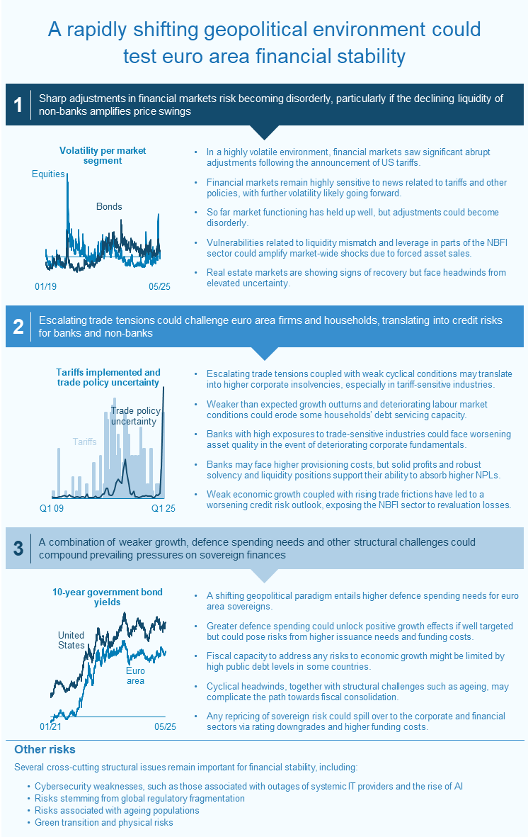 Against this backdrop, three key sources of risk and vulnerability for euro area financial stability stand out. First, price adjustments in stretched and concentrated asset markets risk becoming disorderly, particularly if liquidity and leverage fragilities in parts of the non-bank financial intermediation sector amplify asset price swings. Second, rising trade tensions could affect euro area corporates and households both directly, via exposures to tariff-sensitive activities, and indirectly, via confidence effects, translating into credit risks for banks and non-banks. Third, a combination of weaker growth, defence spending needs and other structural challenges could compound the already strained fiscal positions of some euro area sovereigns. The potential for these vulnerabilities to materialise simultaneously given common triggers, possibly amplifying each other further, increases the risk to financial stability.