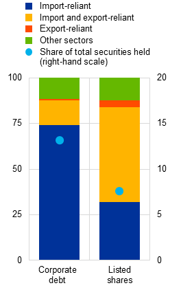 Notes: Panel b: lending to manufacturing sectors (NACE codes C10-C35) as a share of total euro area corporate lending and extra-EU goods exports from euro area countries as a share of total GDP. Panel c: European US-import and US-export-reliant sectors are defined as those scoring above the 75th percentile in the OECD's foreign input reliance and foreign market reliance indicators respectively. Total securities holdings include debt securities, listed shares and investment fund units.