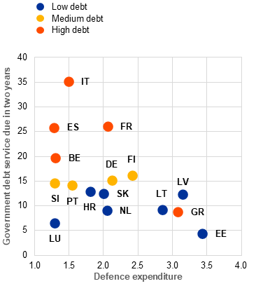 a) Defence expenditure and government debt service across euro area countries | b) Indebtedness of the government, corporate and household sectors |