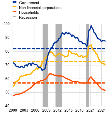 Notes: Panel a: “low debt” refers to countries with debt-to-GDP ratios below 60%, “medium debt” to countries with debt-to-GDP ratios between 60% and 100%, and “high debt” to countries with debt-to-GDP ratios above 100%. “Government debt service due in two years” includes the face value of the sovereign bonds due within two years and the interest accruing on all outstanding sovereign bonds in two years or less as of March 2025. The chart shows only those euro area countries for which 2024 estimates of defence expenditure are available. Estimates of defence expenditures come from NATO, as official euro area data are not yet available for 2024 and may differ from NATO data due to differing classifications of defence expenditures. Panel b: non-financial corporate debt on a consolidated basis. The horizontal lines represent the average for the period. The grey areas show euro area recessions as defined by the Centre for Economic Policy Research.