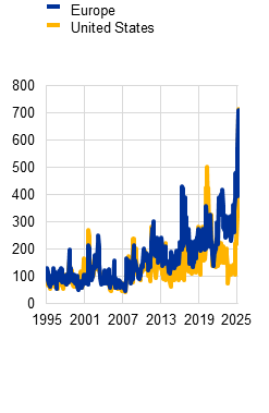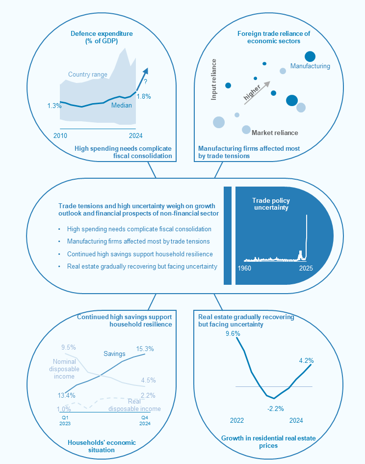 All in all, the financial stability landscape has seen a major uncertainty shock since the previous edition of the Financial Stability Review was published. Despite multiple sources of resilience in both euro area financial and non-financial sectors, there is no room for complacency. Uncertainties arising from trade tensions, deregulation and reduced international cooperation are fuelling concerns about global economic and regulatory fragmentation. Rising trade tensions pose particular risks for the euro area, given its open economy and deep integration within global supply chains. In this highly uncertain and volatile environment, the likelihood of tail events remains high. Risk sentiment could deteriorate again as some risky asset valuations remain high. Increased defence spending, while having the potential to boost growth if well targeted and sourced from within the EU, may exacerbate fiscal vulnerabilities in some countries. While euro area corporates and households are resilient on aggregate, trade policy uncertainty could have an adverse impact on trade-reliant firms, with associated broader economic repercussions translating into rising credit risk for banks and non-banks.