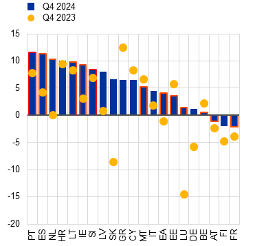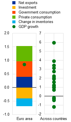 Euro area growth has continued to recover at a moderate pace. Euro area GDP grew by 0.9% in 2024. Growth was driven by private and government consumption and net exports, albeit with large differences across countries (Chart 1.1, panel a). Buoyed by stable real wage growth and high savings, households are in a good position to increase consumption still further (Section 1.4). Moreover, the easing of financing conditions following the ECB’s policy rate cuts since June 2024 should support the recovery going forward. In line with this, survey indicators point towards a notable easing of the downturn in the relatively interest-rate-sensitive industrial sectors (Chart 1.1, panel b), while services sectors have generally been performing better than industrials.