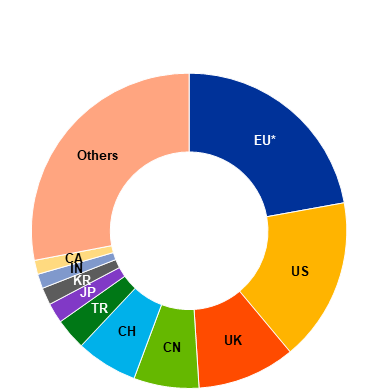 Note: Panel a: CA = Canada, CH = Switzerland, CN = China, EU* = non-euro area EU, UK = United Kingdom, IN = India, JP = Japan, KR = Republic of Korea, TR = Türkiye, US = United States.