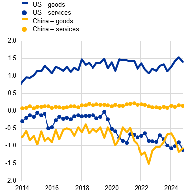 Trade tensions are a source of significant downside risks for euro area growth and may lead to global fragmentation. The euro area economy is open to trade and is highly integrated into global supply chains (Chart 1.2, panel a). As such, the implementation of protectionist measures such as tariffs and other trade barriers by major trading partners is expected to have a negative impact on euro area growth and, potentially, financial stability (Special Feature B). While the current account with the United States is relatively balanced overall, the euro area has a sizeable surplus in goods trade, rendering export-oriented euro area firms particularly vulnerable to US tariffs (Chart 1.2, panel b and Section 1.3). Firms could also be indirectly affected by tariffs on countries producing for the US market if trade were rerouted to the domestic or other third markets, resulting in intense competition. A renewed escalation of trade tensions with a cycle of retaliation would risk igniting a trade war, with significant downside risks to euro area and global growth and increasing geoeconomic fragmentation.