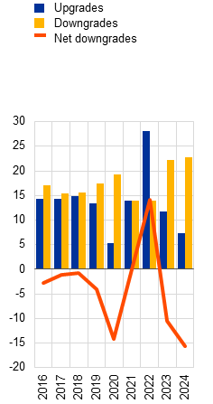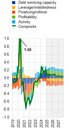 Growth expectations for 2025 have been revised downwards as weak external demand and domestic structural challenges persist. Low productivity growth and a loss of competitiveness, especially in industrial sectors such as the automotive industry, continue to weigh on economic growth. The higher energy costs seen since Russia’s full-scale invasion of Ukraine have represented a particular competitive disadvantage for euro area firms. In addition, domestic demand in China has remained muted as a result of the housing sector crisis, leading to lower demand for European goods and overproduction in the manufacturing sector. Manufactured goods not absorbed in China are being exported instead, increasing competition for European firms. An appreciating euro may further compound these challenges, especially for export-oriented firms. As such, growth expectations for 2025 have been revised downwards since the previous edition of the Financial Stability Review was published (Chart 1.1, panel c).