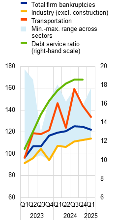 Euro area firms and households have seen balance sheet fundamentals improve in recent years, but trade tensions, high funding costs and a weaker growth outlook point towards future headwinds. On aggregate, euro area corporate and household balance sheets have improved markedly in recent years, with indebtedness falling below the levels observed prior to the global financial crisis. That said, higher interest costs continue to weigh on firm profitability even as new lending rates decline, while insolvencies have been rising across sectors and countries in light of continued weak and uncertain business prospects. On top of increased foreign competition, mounting global trade tensions could add to credit risk in the corporate sector (Chart 4, panel a), which would have a negative impact on the profitability of firms operating in highly export-oriented and tariff-sensitive sectors such as steel and carmaking. Households are currently continuing to benefit from stable labour markets, rising real wages and higher savings. However, this situation could reverse should trade-related corporate vulnerabilities unravel and lay-offs in the corporate sector rise, translating into possible adverse employment and consumption effects. Any notable tightening of financial and credit conditions induced by trade uncertainty could amplify these adverse effects, particularly if also accompanied by weakening consumer confidence and increased precautionary household savings.