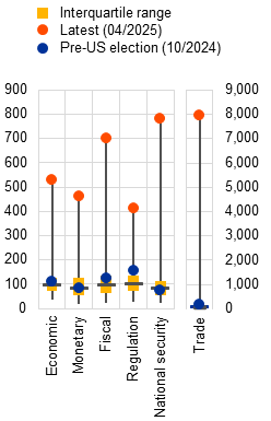 Geopolitical and policy uncertainty have spiked from already high levels since the previous edition of the Financial Stability Review was published. Just as uncertainties stemming from political risks within euro area countries were subsiding, external sources of uncertainty, notably those associated with the unpredictability of a broad range of US policies, have soared (Chart 1, panel a). A lack of clarity surrounds several important economic policy domains, including trade, regulatory and fiscal policies, as well as the level of commitment of the new US Administration to international cooperation (Chart 1, panel b). While it is hard to predict the medium to long-term implications of these individual layers of uncertainty, they entail a broad risk of geoeconomic fragmentation across the globe, in turn raising the likelihood of increasingly frequent and impactful adverse tail events. Although the announcements of trade agreements between the United States and some of its trading partners point towards an easing of trade tensions, concerns remain that these tensions could escalate into a trade war with the potential for significant adverse impacts on global growth, inflation and asset prices. As the euro area is a very open economy which is well integrated into global supply chains, vulnerabilities to these sources of risk are pronounced.