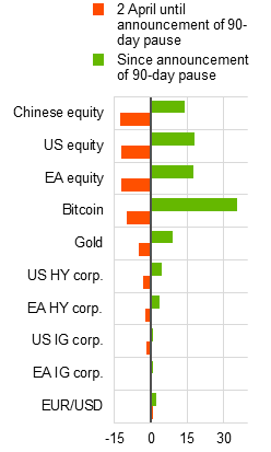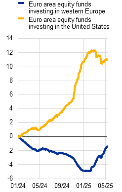 Intensifying trade tensions have triggered a spike in market volatility, fears of slowing economic growth and a sharp repricing in financial markets. The higher than expected US import tariffs announced on 2 April 2025 injected significant volatility into financial markets (Chart 1, panel c). The prospect of slowing economic activity, notably for the United States (Chart 2, panel a), led to a major sell-off in riskier assets, with magnitudes not seen since the early stages of the COVID-19 pandemic. Markets rebounded strongly after a 90-day tariff pause was announced for most countries and had mostly recovered their initial losses by mid-May (Chart 2, panel b). During the turmoil, market functioning – which can be thought of as the ability to trade financial assets quickly without moving prices inordinately – in euro area financial markets held up well. This was despite some atypical shifts away from some traditional safe havens like US Treasuries and the US dollar. In part, this may have been due to technical factors such as investors needing to raise liquidity to meet fund redemptions or margin calls as market volatility rose (Chapter 4), with an unwinding of asset swap or basis trade positions contributing to the sell-off in US Treasuries. But these moves might also have reflected perceptions of a more fundamental regime change, with investors seeming to reassess the riskiness of US assets, possibly leading to broader shifts in global capital flows. This would have potentially far-reaching consequences for the global financial system. Meanwhile, euro area non-banks stayed resilient, with signs of a rotation in fund flow dynamics from the United States to the euro area (Chart 2, panel c).