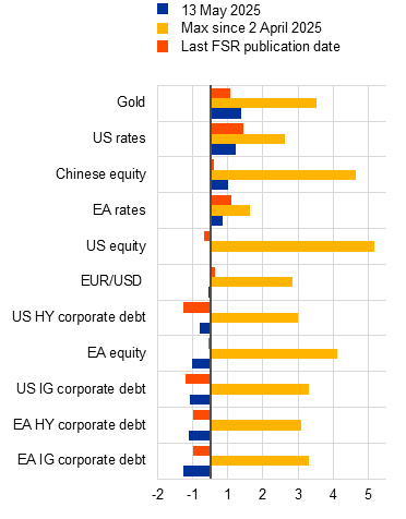 Financial markets, particularly equity markets, remain vulnerable to sudden and sharp adjustments due to persistently high valuations and risk concentration. Previous editions of the Financial Stability Review have warned about the vulnerabilities posed by high valuations that are not backed by fundamentals. This source of risk has now partly materialised, with the larger than expected US import tariffs announced on 2 April 2025 acting as the trigger. Despite notable declines following this announcement, US equity valuations have remained high since the market recovery. Meanwhile, strong market concentration, along with exposures to a handful of large firms (mostly US-based technology companies), continues to expose global markets to risks arising from shocks to these entities. Credit spreads have risen too but they still appear to be out of sync with the currently very high level of geopolitical and policy uncertainty (Chart 3, panel a). As such, investors may be underestimating and underpricing the likelihood and impact of adverse scenarios, not least because soaring uncertainty renders the materialisation of tail events more likely. Negative surprises – including sharply deteriorating economic growth prospects, sudden changes in monetary policy expectations or an escalation of trade tensions – could lead to further abrupt shifts in investor sentiment, causing spillovers across different asset classes while fuelling investors’ interest in alternative asset classes such as gold (Box 2).