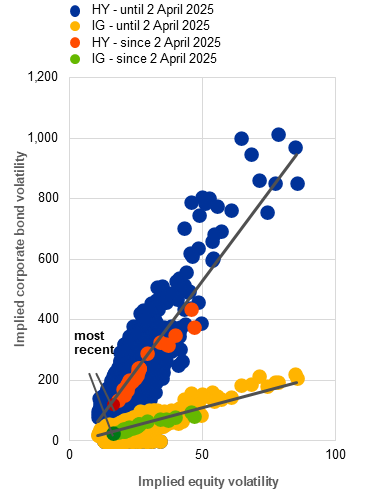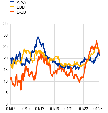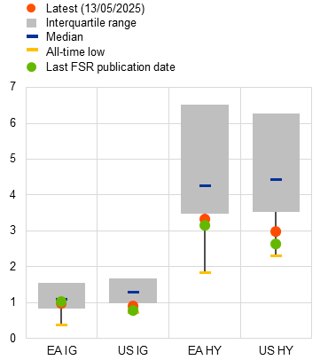 The overall resilience of US corporate bond spreads in light of historically elevated yields has primarily been driven by strong risk appetite, but also by a compositional shift towards better credit quality in new issuances; see the box entitled “Challenges to the resilience of US corporate bond spreads”, Economic Bulletin, Issue 3, ECB, 2025.
