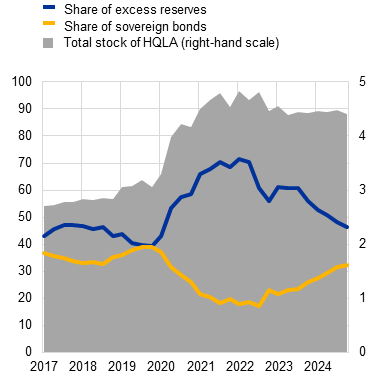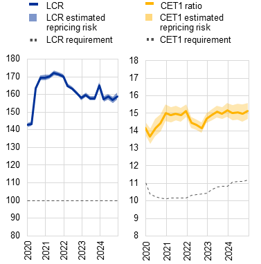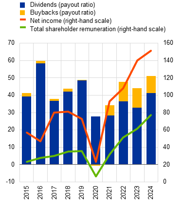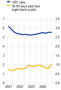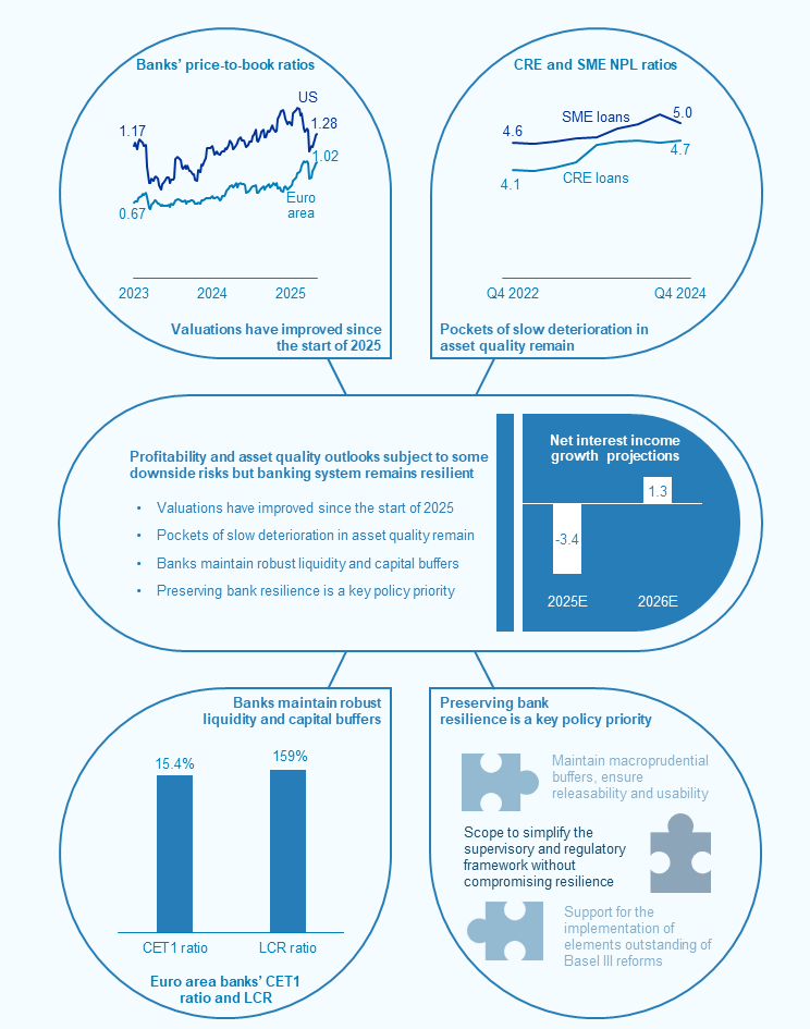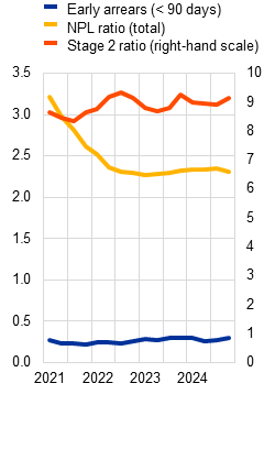 The ability of banks to absorb further asset quality deterioration is supported by the strength of profitability and ample capital and liquidity buffers. Robust net interest income and strong non-interest income growth enabled euro area banks to maintain high levels of return on equity (above 9%) in 2024. Banks’ resilience is also supported by capital and liquidity ratios that are well above regulatory requirements (Section 3.5). There are, however, persistent downside risks to bank profitability arising from lower net interest income, especially for banks with a higher share of floating-rate loans, and a higher cost of risk. A highly uncertain external environment reinforces the need for macroprudential capital buffer requirements to be kept at levels that preserve banking sector resilience. Existing borrower-based measures should be maintained to ensure sound lending standards in all phases of the financial cycle. The prevailing regulatory and supervisory framework, including in the macroprudential remit, has been effective in maintaining financial stability while also supporting economic growth. Nevertheless, there is scope for making the framework more efficient and effective by reducing unwarranted complexities without compromising bank resilience or undermining compliance with the Basel framework, and by completing the banking union.
