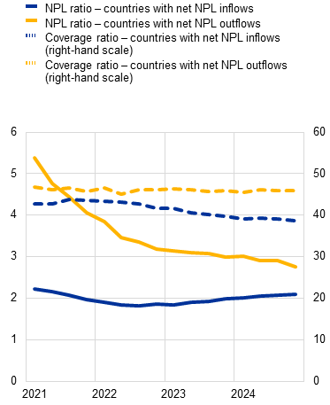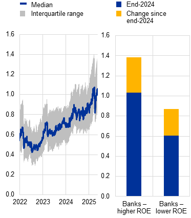 Euro area banks’ asset quality remains robust, but non-performing loans and provisioning needs may rise in the wake of rising trade tensions. On aggregate, euro area banks’ non-performing loan (NPL) ratios remain near historic lows, despite a slight uptick in 2024 driven mainly by net NPL inflows in the corporate loan book (notably CRE and SME loans). That said, the credit risk outlook for corporate and household portfolios remains tilted to the downside, given weak macro-financial conditions, the lagged impact of high interest rates on borrowers and escalating trade tensions. As such, banks may yet face higher provisioning costs if risks in non-financial sectors materialise. In particular, any broader and longer-lasting macro-financial effects of trade policy uncertainty could lead to a deterioration of bank asset quality, with stronger effects on banks with higher exposures to sectors relying on extra-EU trade (Chart 4, panel b and Special Feature B).