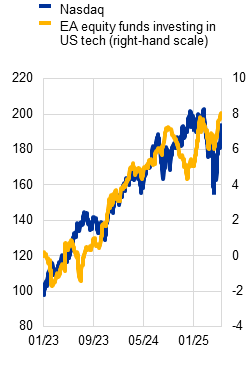 Notes: Panel b: the chart refers only to euro area equity funds investing in US tech equity. Panel c: financial leverage is measured as the ratio of total assets to shares issued, expressed as a percentage. Synthetic leverage is proxied by the gross notional value of derivatives outstanding as a percentage of total assets. EA stands for euro area.