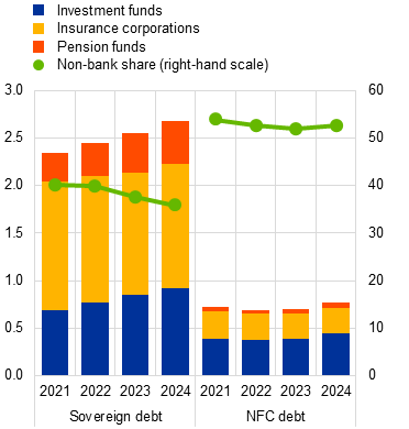 Non-banks play a crucial role in capital market development, yet they operate without a comprehensive macroprudential framework. The euro area non-bank financial intermediation (NBFI) sector has grown significantly since the global financial crisis to become a vital source of funding for the real economy. This growth has helped to diversify sources of financing and support capital market development. Nevertheless, parts of the NBFI sector display notable vulnerabilities. Liquidity mismatch and leverage are pronounced in parts of the investment fund sector and have been rising over the past few years (Section 4.2). Moreover, the decline in high-quality liquid assets in insurers’ portfolios suggests that the sector is not as well prepared to deal with liquidity shocks as it was in the past (Box 5). This is especially important during stressed market conditions, when non-banks may have to sell illiquid assets, thereby amplifying liquidity stress. Previous examples of this include the March 2020 market turmoil and the 2022 UK gilt market stress. Excessive leverage in hedge funds and other leveraged investment funds can amplify stress via the position liquidation and counterparty credit risk channels. It is therefore important that the NBFI policy framework is strengthened from a macroprudential perspective, as the current framework focuses primarily on investor protection and market integrity rather than on reducing systemic risk.