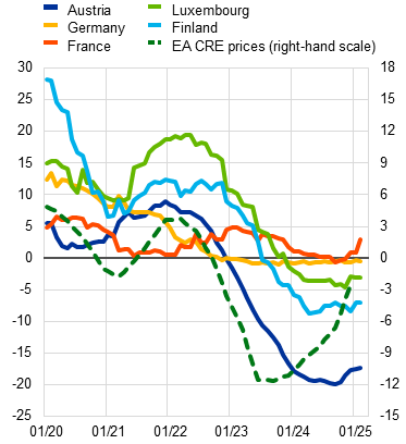 Real estate markets have shown signs of recovery but face headwinds from elevated uncertainty. The downturn in euro area commercial real estate (CRE) markets appears to be bottoming out as recent price corrections have reduced broader overvaluation, while easing monetary policy has strengthened confidence in CRE markets to some extent (Section 1.5). That said, downside risks prevail, as the sector continues to be challenged by structural factors such as lower demand for office space and for non-prime and non-energy efficient properties – which is also evident in higher vacancy rates. Similarly, residential real estate (RRE) prices have shown signs of improvement in countries that experienced rapidly falling prices from their 2022 peaks, supported by improving demand for mortgage loans on the back of lower interest rates. However, tail risks remain due to persisting RRE overvaluation in some countries and possible adverse effects should unemployment rates rise. In fact, real estate markets are highly sensitive to fluctuations in long-term interest rates and business cycle developments, which implies notable downside risks against the current backdrop of high macroeconomic uncertainty and geopolitical risks.