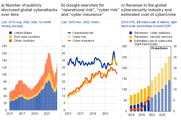Sources: University of Maryland CISSM Cyber Attacks Database, Google Trends, Statista, financial statements of key players, national cybersecurity organisations, IMF, World Bank, UN, Eurostat and ECB calculations.