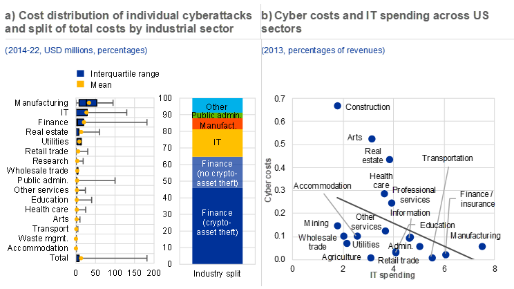 Notes: Panel a: the left graph shows the cost distribution of individual cyberattacks across industrial sectors. The sample size in some sectors is small and hence the results should be interpreted with caution. The right graph shows how the total costs of cyberattacks are allocated across industries. The financial sector cyber costs are split further, based on whether crypto-assets are stolen. Cyberattacks with large outliers in terms of their costs were excluded. Panel b: the InformationWeek500 (IW500) dataset provides an estimate of firms’ IT expenditures as a percentage of revenues (revenues × IW500 measure); the IW500 survey was last carried out in 2013. The survey gathers data on IT spending from 500 US-based firms across various sectors. See Aldasoro, I., Gambacorta, L., Giudici, P. and Leach, T., “The drivers of cyber risk”, Journal of Financial Stability, Vol. 60, June 2022, and Kennedy, D. and Stratopoulos, T., “Mapping IT Spending Across Industry Classifications: An Open Source Dataset”, SSRN, November 2017.